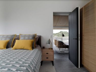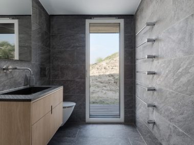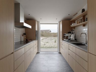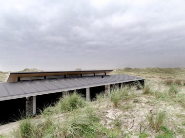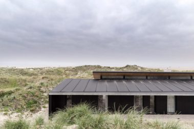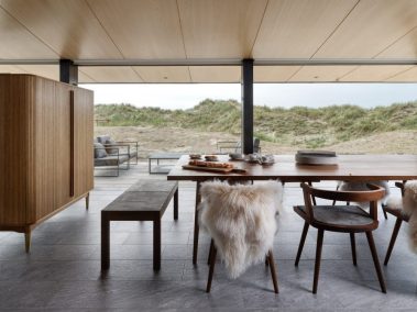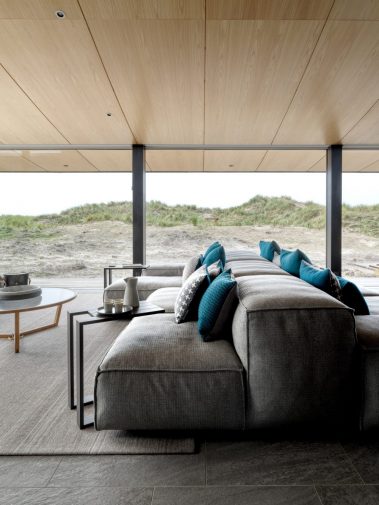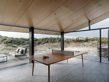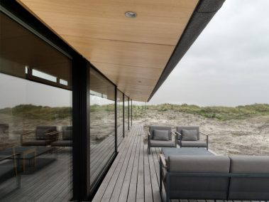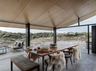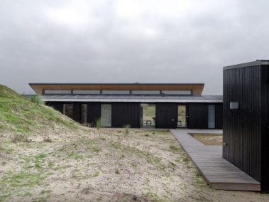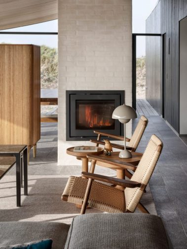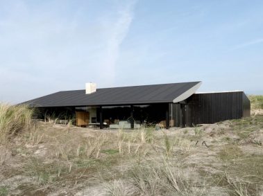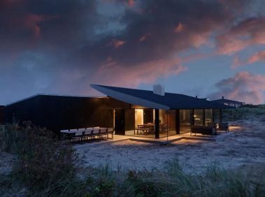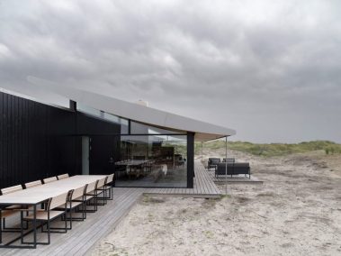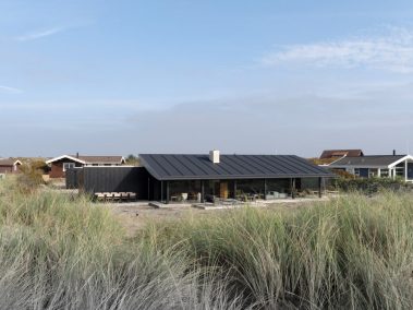 De store glaspartier skaber et fantastisk lysindfald og giver udsigt direkte ud i klitterne, mens de mørke facader og det karakteristiske tag smelter ind i landskabet. Indvendigt er der lagt vægt på naturlige materialer, rene linjer og en varm atmosfære, der understøtter husets rolige placering tæt ved Vesterhavet.